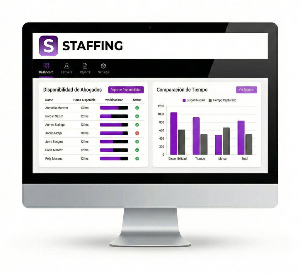 Aplicación web y para dispositivos móviles que permite a los abogados reportar su disponibilidad y cargas de trabajo. Se compara con los reportes de captura tiempo para determinar la veracidad de la información.