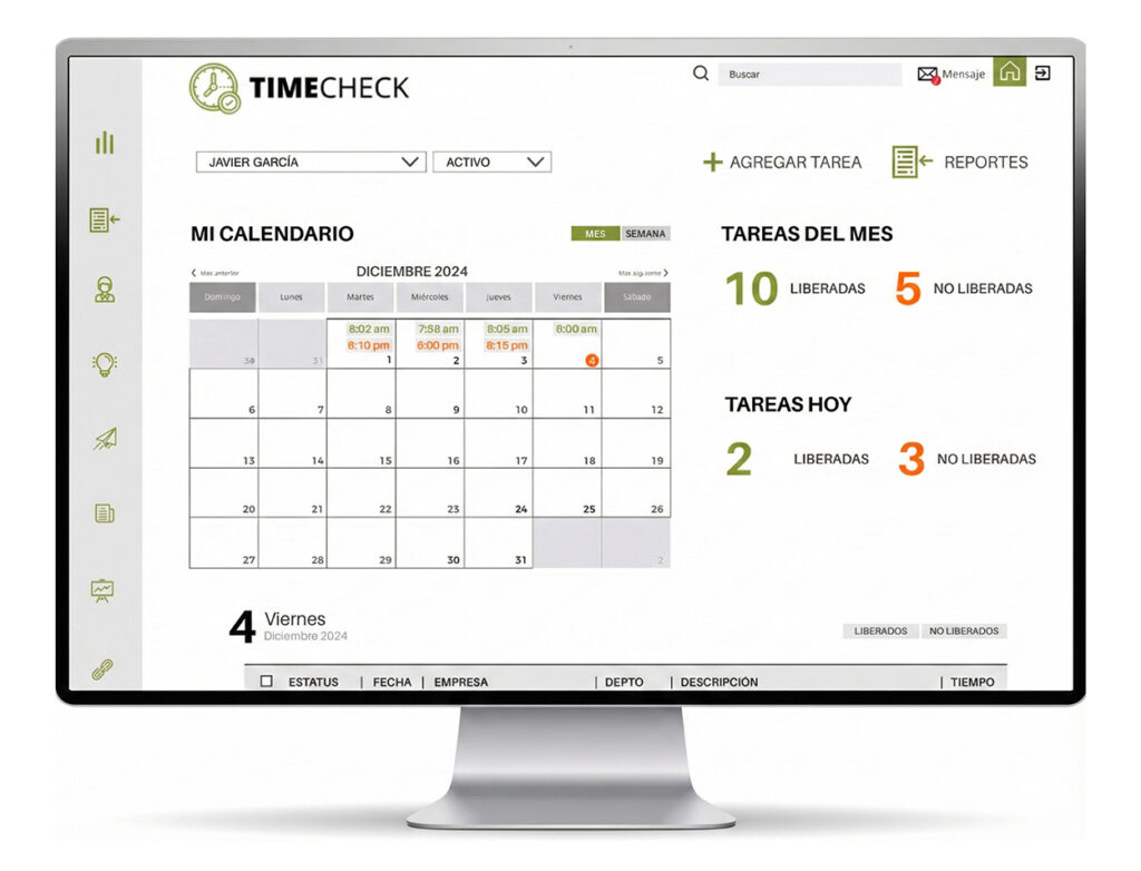 El sistema de tiempos “TIMECHECK” es una plataforma de interfaz sencilla desarrollada para organizaciones de servicios profesionales. Esta herramienta facilita la organización de tiempos, actividades, reportes y proyectos.